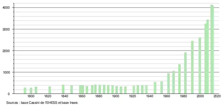L'évolution du nombre d'habitants est connue à travers les recensements de la population effectués dans la commune depuis 1793. Pour les communes de moins de 10 000 habitants, une enquête de recensement portant sur toute la population est réalisée tous les cinq ans, les populations de référence des années intermédiaires étant quant à elles estimées par interpolation ou extrapolation[9]. Pour la commune, le premier recensement exhaustif entrant dans le cadre du nouveau dispositif a été réalisé en 2008[10].