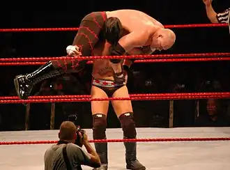 L'attaquant se tient devant l'adversaire, il le fait pencher en avant, enroule le corps avec les bras, le soulève vers le haut et le fait tourner horizontalement souvent pour produire un tilt-a-whirl backbreaker.