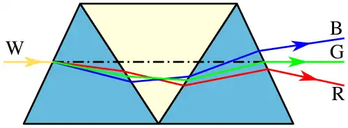Alors qu’un unique prisme disperse la lumière en la déviant, un prisme à vision directe la disperse sans trop la dévier, ce qui simplifie les montages.