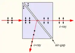 Toutefois, cette transmission n'est pas parfaite a priori, car d'après les coefficients de Fresnel, une partie de la lumière polarisée p est réfléchie. On taille donc les prismes de façon que le rayon lumineux arrive à l'angle de Brewster sur la couche d'air, c'est-à-dire l'angle auquel il n'y a aucune réflexion de la polarisation p. Ainsi plus de lumière est transmise par rapport au prisme de Glan-Foucault[1] par exemple.
