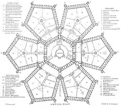 La prison était centrée sur une chapelle circulaire, entourée d'abord d'un hexagone d'ailes à trois étages comportant les appartements du directeur, les bureaux d'enregistrement et l'intendance (blanchisserie, cantine) ; ce périmètre intérieur donnait à son tour sur six blocs cellulaires en forme de pentagones. Ces immeubles pentagonaux cernaient cinq petites cours (avec un mirador au centre) contre les bâtiments de l'administration : elles étaient réservées à la promenade et au travail en plein air des détenus[8]. Les trois sommets extérieurs de chaque pentagone servaient à la fois de tours de surveillance, de cages d'escaliers et contenaient les sanitaires[9],[10]. Les deux pavillons du nord-ouest, les plus éloignés de l'entrée, étaient réservés aux détenues.