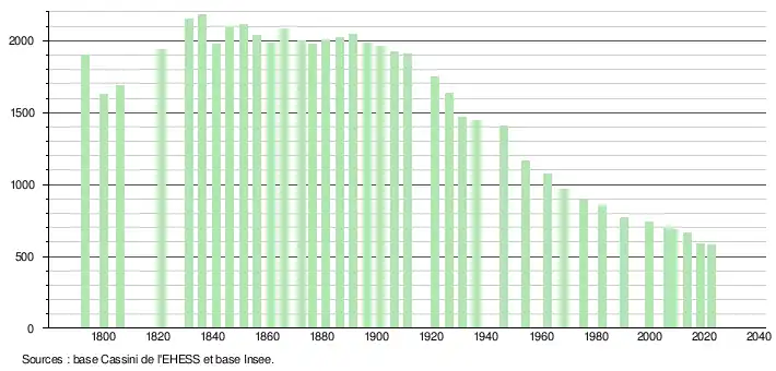 L'évolution du nombre d'habitants est connue à travers les recensements de la population effectués dans la commune depuis 1793. Pour les communes de moins de 10 000 habitants, une enquête de recensement portant sur toute la population est réalisée tous les cinq ans, les populations de référence des années intermédiaires étant quant à elles estimées par interpolation ou extrapolation[30]. Pour la commune, le premier recensement exhaustif entrant dans le cadre du nouveau dispositif a été réalisé en 2008[31].