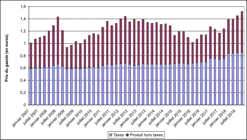 Entre 2016 et 2018, les prix ont fortement augmenté. Pour le gazole, le prix est passé de 1,02 €/l à 1,52 €/l, soit une augmentation de 0,50 €/l. Cette augmentation se décomposait en une hausse de 32 centimes pour le produit hors taxes et de 18 centimes de taxes. Ainsi les taxes ne comptent que pour un tiers (36 %) dans cette augmentation[37].