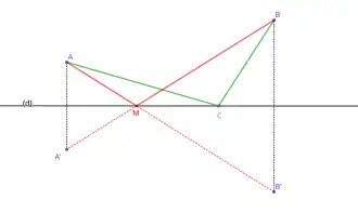 Ce problème peut se résoudre avec les outils de l'optimisation, cependant un raisonnement purement géométrique donne un résultat plus simple et plus lisible : pour trouver le point solution M, il suffit de construire le symétrique A' de A par rapport à (d), puis de marquer M comme l'intersection de A'B et (d). En effet, par le principe de Fermat, le chemin le plus court dans le plan euclidien étant la ligne droite, on trace ainsi la ligne brisée la plus courte[1].