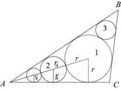 - déterminer trois cercles tracés à l'intérieur d'un triangle, de sorte que chaque cercle soit tangent aux deux autres et à deux côtés du triangle,