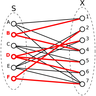 Alors, la sous-collection = {B, D, F} est une couverture exacte de U, puisque chaque élément est contenu dans exactement un des ensembles B = {1, 4}, D = {3, 5, 6}, ou F = {2, 7}.