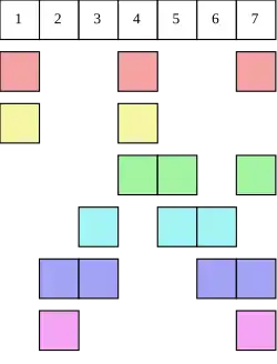 Si dans l'exemple 2 ci-dessus, nous représentons les 6 ensembles A, B, C, D, E et F de sous forme de lignes et les 7 éléments dans U = {1, 2, 3, 4, 5, 6, 7} sous forme de colonnes, alors le problème de la couverture exacte est représenté par la matrice 6×7 :