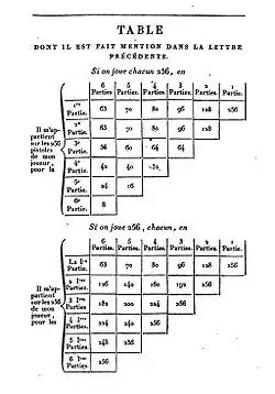 - ↑ « Partis » et non « Parties » car il s'agit d'un problème de « partage » même si le support en est un jeu qui comporte des « parties ».