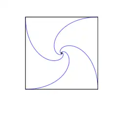 On suppose quatre souris au sommet d'un carré unitaire ABCD. La souris A poursuit la souris B qui poursuit la souris C qui poursuit la souris D qui poursuit la souris A. Les quatre souris se déplacent à la même vitesse constante unitaire. Au fur et à mesure des déplacements les souris parcourent des segments de droites et modifient leur trajectoire pour rester en direction de leur cible. Les souris se rencontrent après un temps d'une unité car la distance entre deux souris voisines décroît toujours à la vitesse d'une unité.