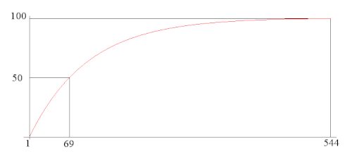 Pour vignettes à collectionner, ce graphique présente en abscisse le nombre moyen de paquets nécessaires pour obtenir les vignettes situées en ordonnée, montrant combien les dernières vignettes sont les plus longues à obtenir.