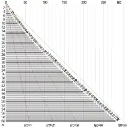 Graphique qui donne, pour chaque nombre n de vignettes différentes (axe vertical), le nombre moyen E(T) de paquets de céréales à acheter pour les posséder toutes (axe horizontal).