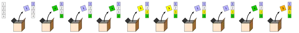 Exemple d'une collection de 4 vignettes possibles : 1, 2, 3, 4. Sur l'exemple, à l'étape 1 on obtient la vignette 1, à l'étape 2, la vignette 4. à l'étape 3, la vignette 1 à nouveau, etc.