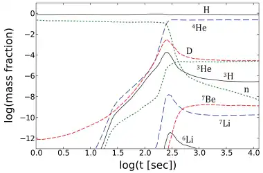Le modèle de la nucléosynthèse primordiale permet d’expliquer la formation et l’abondance des éléments légers (de l’hydrogène jusqu’au béryllium). Elle débute environ 3 minutes après le Big Bang[1]. Différentes réactions nucléaires impliquant les protons et les neutrons permettent de produire ces noyaux. La réaction p + n → D + γ démarre et d’autres réactions à base de deutérium conduisent principalement à la formation d’hélium mais également, en moindres proportions, de lithium[2] (voir la figure ci-contre).