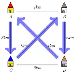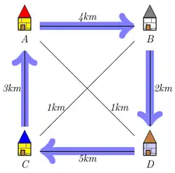 - Problème du voyageur de commerce asymétrique : Étant donné un ensemble de nœuds et de distances pour chaque paire de nœuds, trouver un cycle de longueur minimale qui visite chaque nœud exactement une fois. Cette fois-ci la distance entre deux nœuds et d'une arête n'est pas forcément la même qu'on aille de à ou bien de à .