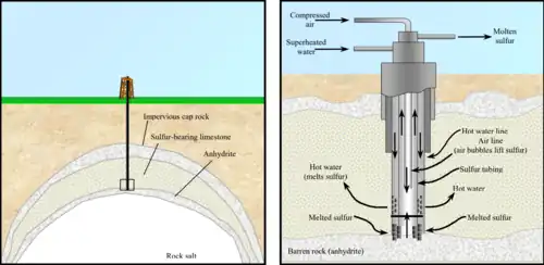 Le procédé Frasch pour le soufre est utilisé pour l'extraction d'un dôme de sel ou dans des dépôts d'évaporite, car le soufre y est stocké dans des bancs rocheux perméables piégés entre deux couches imperméables. Dans le cycle du soufre, l'altération d'origine bactérienne de l'anhydrite ou gypse, en présence d’hydrocarbures, produit du carbonate de calcium et du sulfure d'hydrogène. Or le sulfure d'hydrogène s'oxyde en soufre élémentaire, par la présence d'eau de percolation, ou sous l’action de bactéries anaérobies[3],[4].