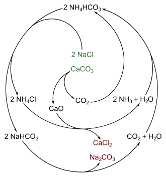 Le procédé Solvay produit finalement du carbonate de sodium (Na2CO3) à partir de sel (chlorure de sodium NaCl) et de craie (carbonate de calcium CaCO3) en utilisant habilement l'alcali ammoniac (NH3) ; on obtient en outre du chlorure de calcium (CaCl2), un sous-produit qui n'est pas un déchet mais peut être un produit utile. Le procédé utilise de l'ammoniac qui n'est pas consommé mais réutilisé après régénération et recyclage, à partir de l'intermédiaire NH4Cl.