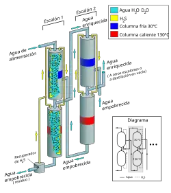On va donc faire barboter du sulfure d'hydrogène dans de l'eau chaude, qui va s'appauvrir en deutérium au profit du gaz, puis faire barboter le même gaz dans de l'eau froide, qui va s'enrichir en deutérium tandis que le gaz revient à son état initial pour refaire le circuit. La solubilité du gaz dans l'eau et la vitesse de la réaction sont suffisantes pour ne pas être les facteurs limitants, ce qui compte c'est donc la constante d'équilibre K qui vaut 2,33 à 30 °C, alors qu'à 130 °C, elle vaut 1,82. Cette différence est relativement faible de sorte que l'enrichissement n'est que de 15 à 20 %, et qu'il faut donc répéter l'opération plusieurs fois avec des unités similaires (mais un peu plus petites à chaque fois) en série, chacune récupérant l'eau chaude appauvrie de l'étage suivant vers lequel elle envoie son eau froide enrichie. L'eau chaude appauvrie du premier étage est rejetée tandis que l'eau froide du dernier étage (concentration du deutérium supérieure à 99 %) est envoyée vers une unité de distillation sous vide pour l'enrichissement final, qui doit atteindre 99,75 %[2].