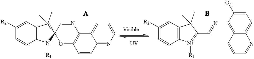 Le photochromisme des composés du type de celui reporté figure 11 est observé à l’état liquide dans différents solvants et à l’état solide lorsque les molécules sont piégées dans des matrices polymériques organiques. Les applications potentielles des photochromes organiques sont importantes et variées, en particulier dans les domaines des matériaux à transmission optique variable (« verres organiques » photochromiques) et celui du stockage optique de l’information. L’introduction des molécules dans des matrices hybrides organiques-inorganiques, en particulier celles préparées à partir de précurseurs alkylalkoxydes, conduit à un comportement photochromique comparable à celui observé dans les polymères organiques classiques. Le photochromisme est dit normal et les échantillons incolores sont transformés en xérogels colorés par irradiation UV. La forme stable dans ces matrices hybrides est donc la forme A (figure 12a). Lorsque les molécules sont introduites dans un xérogel purement inorganique, la forme B ionique est stabilisée par liaison hydrogène avec les groupes silanols de la matrice gel. Le photochromisme est alors inverse : les gels sont décolorés par action de la lumière visible (figure 12b).