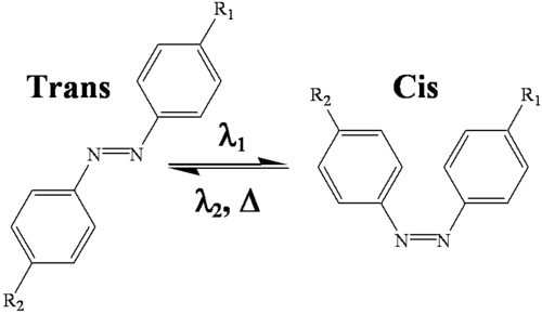 Les colorants de la famille des azobenzènes peuvent subir une réaction de photoisomérisation de la forme trans à la forme cis lorsqu’ils sont soumis à une irradiation lumineuse de longueur d’onde précise (figure 13). Le retour vers la forme thermodynamiquement plus stable (isomère trans) s’effectuant de façon photochimique ou thermique.