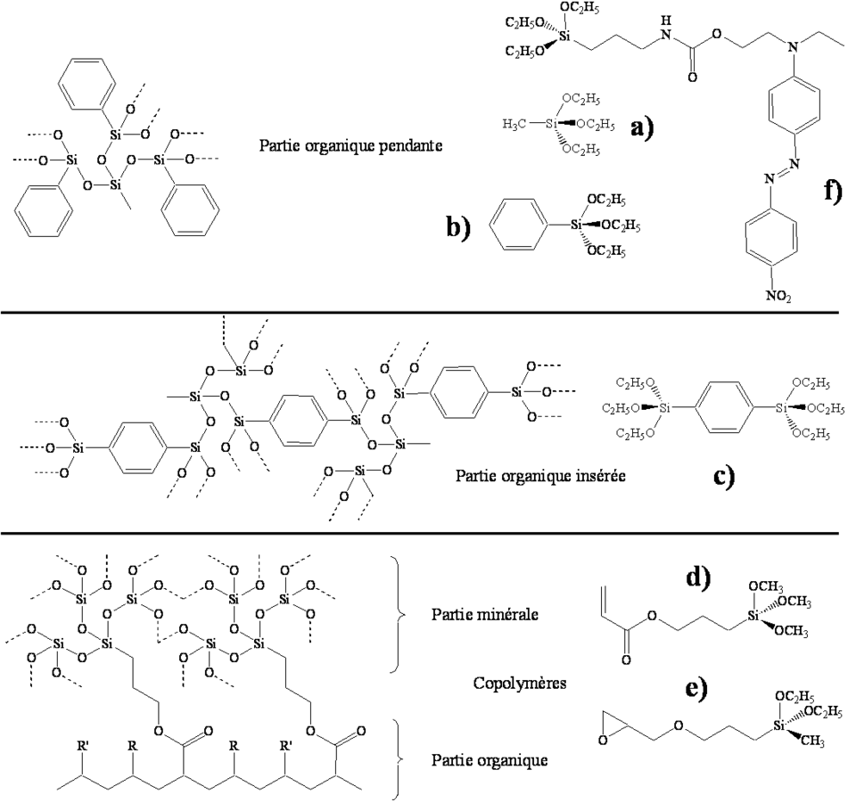Les figures 8a et 8b donnent des exemples de chaînons organiques modificateurs utilisés dans la technologie hybride. Ils confèrent au matériau final des propriétés spécifiques (accentuation du caractère hydrophobe, amélioration de certaines propriétés mécaniques, etc.). Ils se retrouvent alors comme unités pendantes. Dans le cas de la figure 8c, la partie organique est intégrée au réseau minéral. Par ailleurs la présence de groupements organiques polymérisables (formateurs) permet d’envisager une double polymérisation, organique et minérale. Les molécules décrites figures 8d et 8e portent respectivement une fonction acrylate et époxyde. Ces matériaux hybrides intermédiaires entre verre minéral et polymère organique offrent un large éventail de propriétés inédites fruit de l’association des deux mondes minéral et organique.