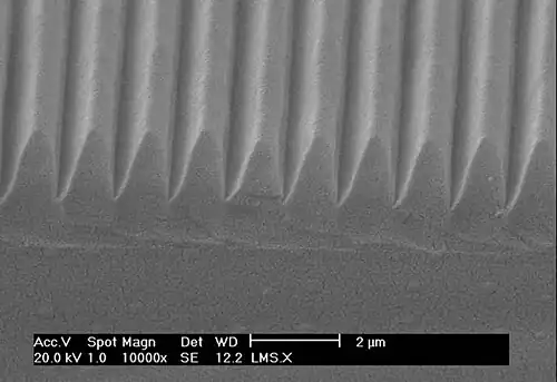 Pour les matrices faiblement réticulées, le déplacement de matière intervient précisément lorsqu’une figure d’interférences créée à partir d’un laser est projetée sur le matériau (film mince de l’ordre du micromètre). Dans les zones éclairées de cette figure d’interférence la photoisomérisation des azobenzènes intervient et provoque une migration moléculaire conduisant à l’inscription de réseaux de surface. La figure 15 donne un aperçu de cette déformation de surface observée en microscopie électronique à balayage.