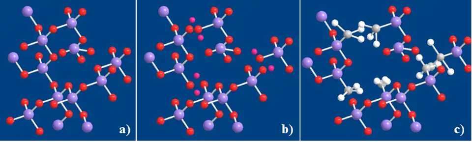 Lors de la préparation de matériaux sol-gel dopés, on peut vouloir conserver autant que possible les propriétés du système moléculaire dans le matériau composite en affaiblissant au maximum le couplage molécule-matrice. Dans ce but, l’utilisation de précurseurs alkylalkoxydes R’-Si(OR)3 permet de tapisser la surface des pores avec les groupements organiques R’, donc de limiter les interactions chimiques à des liaisons faibles de type van der Waals.