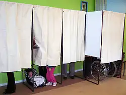 Il n'existe qu'une seule urne et qu'une seule liste d'émargement afin de limiter les risques de fraude. Il y a plusieurs isoloirs (un par trois-cents électeurs[44]), afin de laisser au citoyen le temps de choisir en toute sérénité son bulletin, sans bloquer la file d'attente, tout en garantissant le secret du vote. L'accessibilité pour les personnes handicapées doit être assurée. Les personnes qui ne peuvent signer la liste d'émargement doivent être signalées par un électeur accompagnateur.