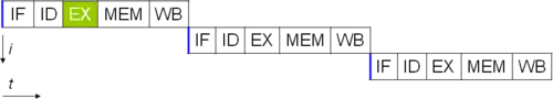 Modèle de processeur subscalaire : il faut 15 cycles d'horloge pour exécuter trois instructions.