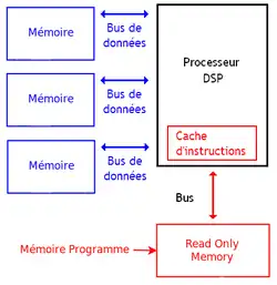Un DSP ne possède généralement pas de mémoires caches pour les données. Il arrive qu'il ait des mémoires caches pour les instructions, afin d’accélérer l’exécution de certaines boucles, mais c'est relativement rare.
