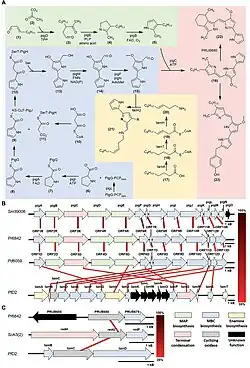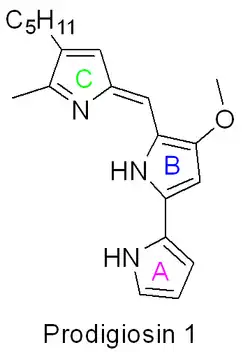 La biosynthèse de la prodigiosine[15],[16] et des analogues apparentés, les prodiginines[3],[14], implique le couplage convergent de trois anneaux de type pyrrole (marqués A, B et C sur la figure 1) à partir de L-proline, L- sérine, L-méthionine, pyruvate et 2-octénal[17].