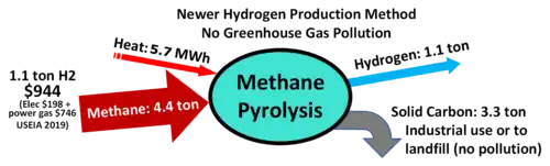 La pyrolyse plasmatique consiste à casser directement par plasma la molécule du méthane (CH4) en hydrogène et en carbone. Celui-ci est obtenu sous forme de poudre impalpable de noir de carbone, sans aucune production de CO2. La consommation d’électricité est de quatre à cinq fois moindre que celle de l'électrolyse. La poudre de carbone peut être revendue à certaines industries (pneumatiques, par exemple). Ce procédé est developpé par la startup française Spark Cleantech en partenariat avec le CNRS[54][source secondaire nécessaire].
