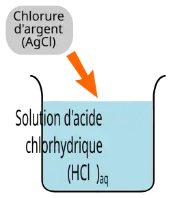 Soit par exemple la dissolution du chlorure d'argent dans une solution d'acide chlorhydrique de concentration molaire 0,1 mol L−1 et de volume 1 L. L'acide chlorhydrique étant un acide fort, il se dissocie complètement en cations H+ et anions Cl−. Le chlorure d'argent se dissocie suivant la réaction :
