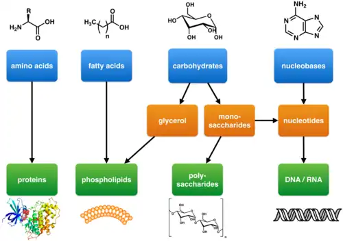 Les métabolites primaires impliqués dans la production d'énergie comprennent les enzymes respiratoires et photosynthétiques. Les enzymes à leur tour sont composées d'acides aminés et souvent de cofacteurs non peptidiques qui sont essentiels à la fonction enzymatique[21]. La structure de base des cellules et des organismes est également composée de métabolites primaires. Il s'agit notamment des membranes cellulaires (par ex. des phospholipides), des parois cellulaires (par ex. la peptidoglycane ou la chitine) et des cytosquelettes (protéines)[22].