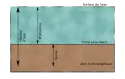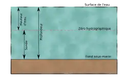 La profondeur, distance entre le fond et la surface de l'eau, est symbolisée par la lettre . Elle est en relation avec la hauteur d'eau et la sonde : algébriquement : [3].