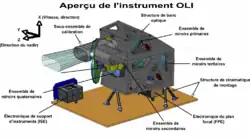 • OLI (Operational Land Imager) est l'instrument principal. Ce radiomètre multispectral acquiert des images dans neuf bandes spectrales allant du visible au moyen infrarouge. Sept de ces bandes spectrales sont déjà présentes sur l'instrument ETM+ de Landsat-7, Deux canaux supplémentaires sont ajoutés, destinés principalement à la correction atmosphérique (canal bleu à 440 nm) et à la détection des nuages (1 380 nm). Enfin, les bandes dans l'infrarouge thermique sont maintenant confiées à l'instrument TIRS (voir ci-dessous). La technologie utilisée sur OLI est radicalement différente de celle des instruments précédents. Le scanner à miroir oscillant (whiskbroom (en)) est remplacé par une barrette fixe de détecteurs qui capte les données sur toute la largeur du champ optique (capteur en peigne (en) ou pushbroom). L'instrument utilise une technologie testée à bord du satellite expérimental EO-1. La résolution optique est de 30 mètres sur toutes les bandes sauf sur la bande panchromatique (15 m).