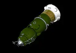 - le module orbital BO (бытовой отсек) d'une longueur de 4,55 mètres, de forme conique (2,93 mètres de diamètre), est tronqué à l'avant par le système d'amarrage mâle Kontakt assisté de 4 amortisseurs (en lieu et place du système IGLA du Soyouz[33]) permettant une jonction en douceur avec le LK. Autour se trouvent 6 réservoirs pour les moteurs-fusées de manœuvre du SA. Comme on le voit, le système Kontakt ne possède pas de sas, obligeant le cosmonaute à effectuer une sortie extravéhiculaire mais ayant aidé à réduire le poids du LOK et à simplifier son architecture[34]. Au-dessus du module est installé le système de contrôle d'altitude ODOP, au-dessous un télémètre laser-optique[35]. Le BO héberge également le système de support-vie Rosa qui recycle l'humidité en eau potable[36] ;