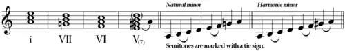 L'écart entre une tonique mineur et son relatif majeur — une tierce mineure — encourage les progressions ascendantes de gammes surtout lors de l'utilisation de gammes pentatoniques. On peut l'entendre sur Black Girl de Huddie Ledbetter et à partir des années 1960 dans la musique pop britannique avec des enregistrements tels que la chanson traditionnelle House of the Rising Sun reprise par le groupe The Animals et For Your Love de Graham Gouldman/The Yardbirds. I - III - IV (ou iv) - VI est une progression typique de cette sorte de séquence.