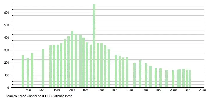 L'évolution du nombre d'habitants est connue à travers les recensements de la population effectués dans la commune depuis 1793. Pour les communes de moins de 10 000 habitants, une enquête de recensement portant sur toute la population est réalisée tous les cinq ans, les populations de référence des années intermédiaires étant quant à elles estimées par interpolation ou extrapolation[23]. Pour la commune, le premier recensement exhaustif entrant dans le cadre du nouveau dispositif a été réalisé en 2008[24].