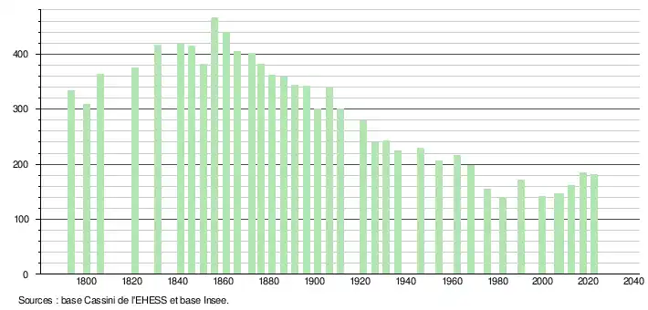 L'évolution du nombre d'habitants est connue à travers les recensements de la population effectués dans la commune depuis 1793. Pour les communes de moins de 10 000 habitants, une enquête de recensement portant sur toute la population est réalisée tous les cinq ans, les populations de référence des années intermédiaires étant quant à elles estimées par interpolation ou extrapolation[22]. Pour la commune, le premier recensement exhaustif entrant dans le cadre du nouveau dispositif a été réalisé en 2007[23].