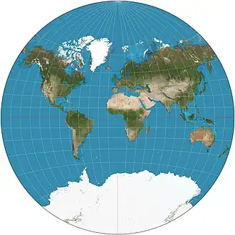 La carte est incluse dans un cercle de rayon r. Le parallèle de référence est l'équateur. Le parallèle de référence et le méridien de référence sont représentés par deux diamètres perpendiculaires de ce grand cercle et constituent les axes de la carte[4].