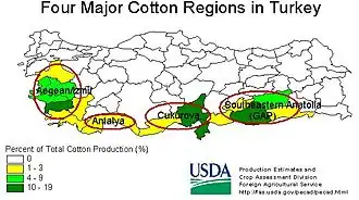 Le GAP devrait doubler les surfaces agricoles irriguées de la Turquie. L'augmentation de l'activité agricole du GAP est montrée par les cartes ci-dessus. La production de coton est déjà passée de 150 000 à 400 000 tonnes, faisant de la région le premier producteur du pays.