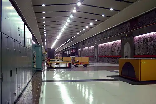 La centrale Robert-Bourassa a été aménagée dans une caverne de roc à 6 km en aval du barrage. Creusée à 137,2 m sous le niveau du réservoir, la centrale abrite 16 turbines Francis d'une puissance nominale de 333 MW pour une puissance installée originale de 5 328 MW[49]. Les groupes sont alimentés par des conduites forcées individuelles à partir d'une prise d'eau construite dans une vallée secondaire[35]. Les dimensions de sa centrale souterraine (483 mètres de long, 22 mètres de large et 45 mètres de haut) en font la plus grande du monde[50].