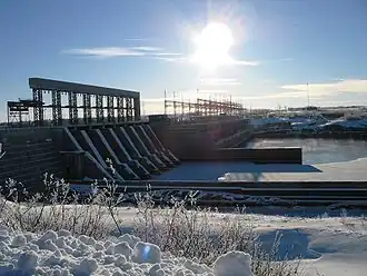 Parallèlement à ce tracé, une route de glace est construite pour déplacer les équipements et le matériel nécessaire vers le nord. Le projet atteint son premier objectif avec la mise en service, le , d'un pont de glace de 555 m[44] qui traverse la rivière Rupert[45],[46]. La route temporaire atteint la Grande Rivière en et permet de répondre aux besoins logistiques minimaux nécessaires pour engager les travaux ainsi que la construction des infrastructures nécessaires afin de loger et de nourrir les milliers de travailleurs qui se succéderont au cours des dix prochaines années.