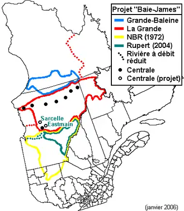 Au Québec (Canada), le projet de la Baie-James désigne une série d'aménagements hydroélectriques construits pour Hydro-Québec par la Société d'énergie de la Baie James dans le bassin versant de la Grande Rivière et d'autres rivières du Nord-du-Québec depuis 1973. La puissance installée des neuf centrales en service atteint 16 527 mégawatts (MW) à la fin de 2010[1]. Deux centrales, Eastmain-1-A (768 MW) et de la Sarcelle (150 MW) portent la capacité du complexe à 17 445 MW en 2012. La puissance installée du complexe équivaut à celle de toutes les centrales électriques d'un pays comme la Belgique[2].
