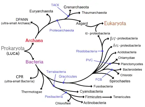 Admettant la théorie de la fusion des génomes entre Bactéries et Archées (pour engendrer les Eucaryotes), d'autres biologistes comme Rivera et Lake (2004)[27] tendent à remplacer l'image de l'arbre phylogénétique des Procaryotes par une forme circulaire, ou « anneau » de la vie [28],[29].