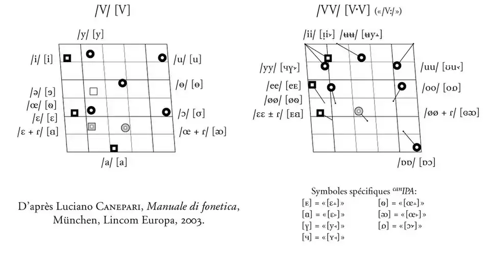 - /ɛː/ [ɛ̝ɛ̙] : part d’un è d’aperture moyenne pour arriver à un è vraiment ouvert, mais antéro-central (= plus postérieur qu’en français).