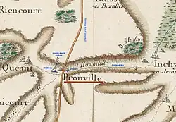 La carte de Cassini ci-dessus montre qu'au milieu du XVIIIesiècle, Pronville est une paroisse traversée par le ruisseau L'Hirondelle.