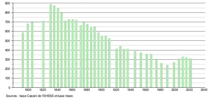 L'évolution du nombre d'habitants est connue à travers les recensements de la population effectués dans la commune depuis 1793. Pour les communes de moins de 10000habitants, une enquête de recensement portant sur toute la population est réalisée tous les cinqans, les populations de référence des années intermédiaires étant quant à elles estimées par interpolation ou extrapolation[52]. Pour la commune, le premier recensement exhaustif entrant dans le cadre du nouveau dispositif a été réalisé en 2006[53].