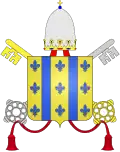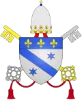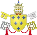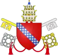 | 34. | Des fasces d'Aquitaine | Clément V (1305–1314) | Bertrand de Got | Aquitain de naissance, dont les armes sont des fasces. Clément V était évêque de Saint-Bertrand-de-Comminges en Aquitaine, avant de devenir archevêque de Bordeaux, toujours en Aquitaine. Ses armoiries comportent trois barres horizontales, appelées « fasces » en langage héraldique[5],[54]. | ![]() |