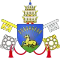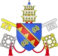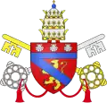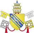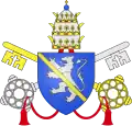| 32. | De la bénédiction des flots | Boniface VIII (1294–1303) | Benedetto Caetani | Anciennement nommé Benoît, de Gaeta, dont les armes portent des vagues. Les armes de Boniface VIII sont traversées par « une jumelle ondée d'azur », deux lignes de vagues parallèles. La devise constitue également un jeu de mots sur le lieu de naissance de Boniface VIII — il a vu le jour à Gaeta, ville maritime du Latium — et sur son prénom — Benedetto signifie également béni[51],[52]. | ![]() |